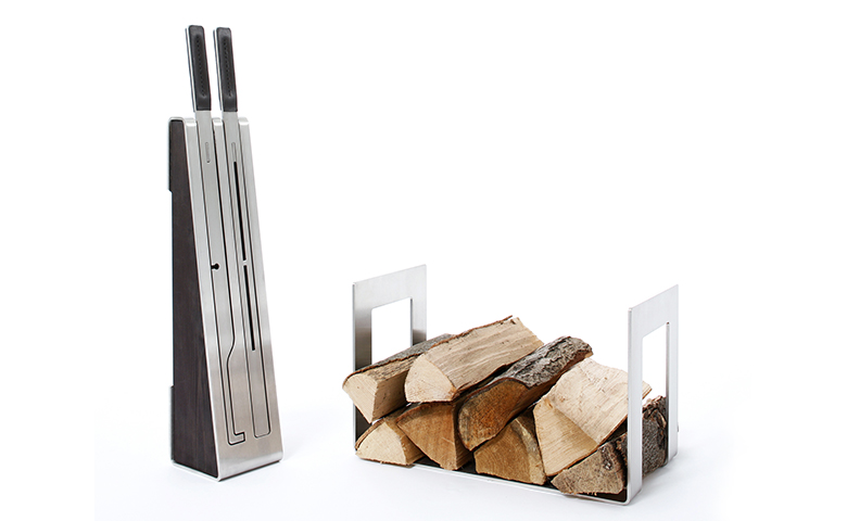 Fireplace tools and firewood basket made of a single stainless-steel plate – laser cut and folded without loss of material. The two pokers, trimmed with core leather, are inserted into each other to form the fire tongs.