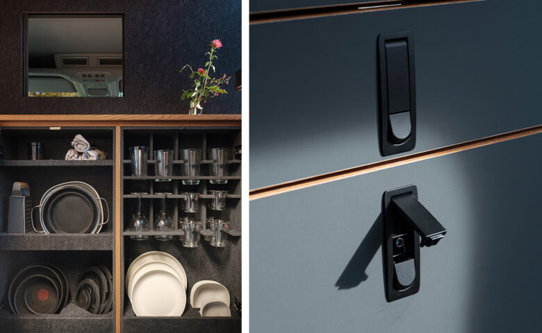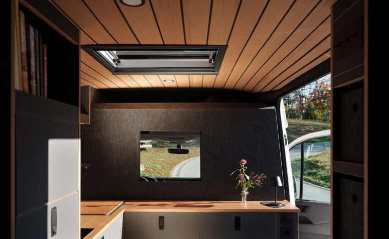 The small series “Patgific” was developed in collaboration with the Swiss company Cocoon Vans. The challenge was to combine high-quality technology and craftsmanship with a clear, comfortable design. The interior is made of high-quality natural and recycled materials. The deliberate separation of the driver’s cab and living area creates a compact, multifunctional, and atmospheric space for living, cooking, working, and sleeping. A cozy retreat from which to embark on a journey of discovery.
